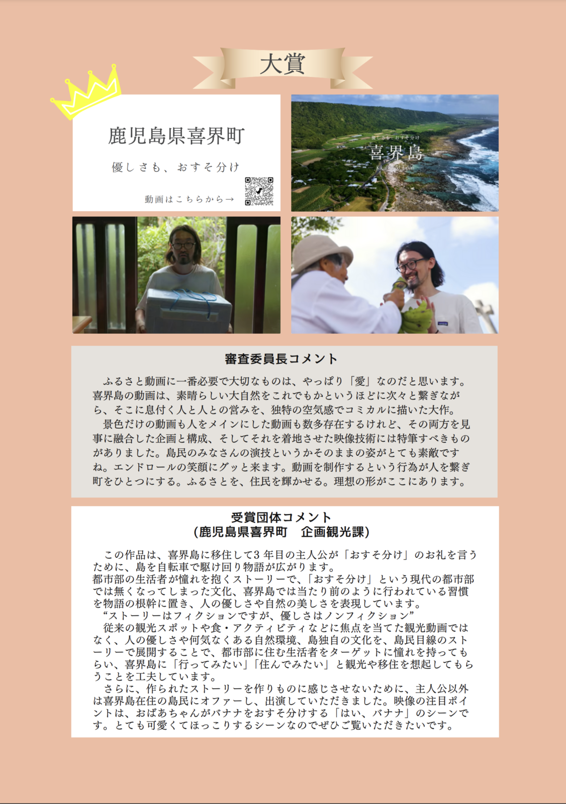 喜界町から委託を受け2023年に制作した「優しさも、おすそ分け」が、一般財団法人 地域活性化センターが主催する地域プロモーションアワード2024において、応募動画104作品の中から大賞を受賞しました。