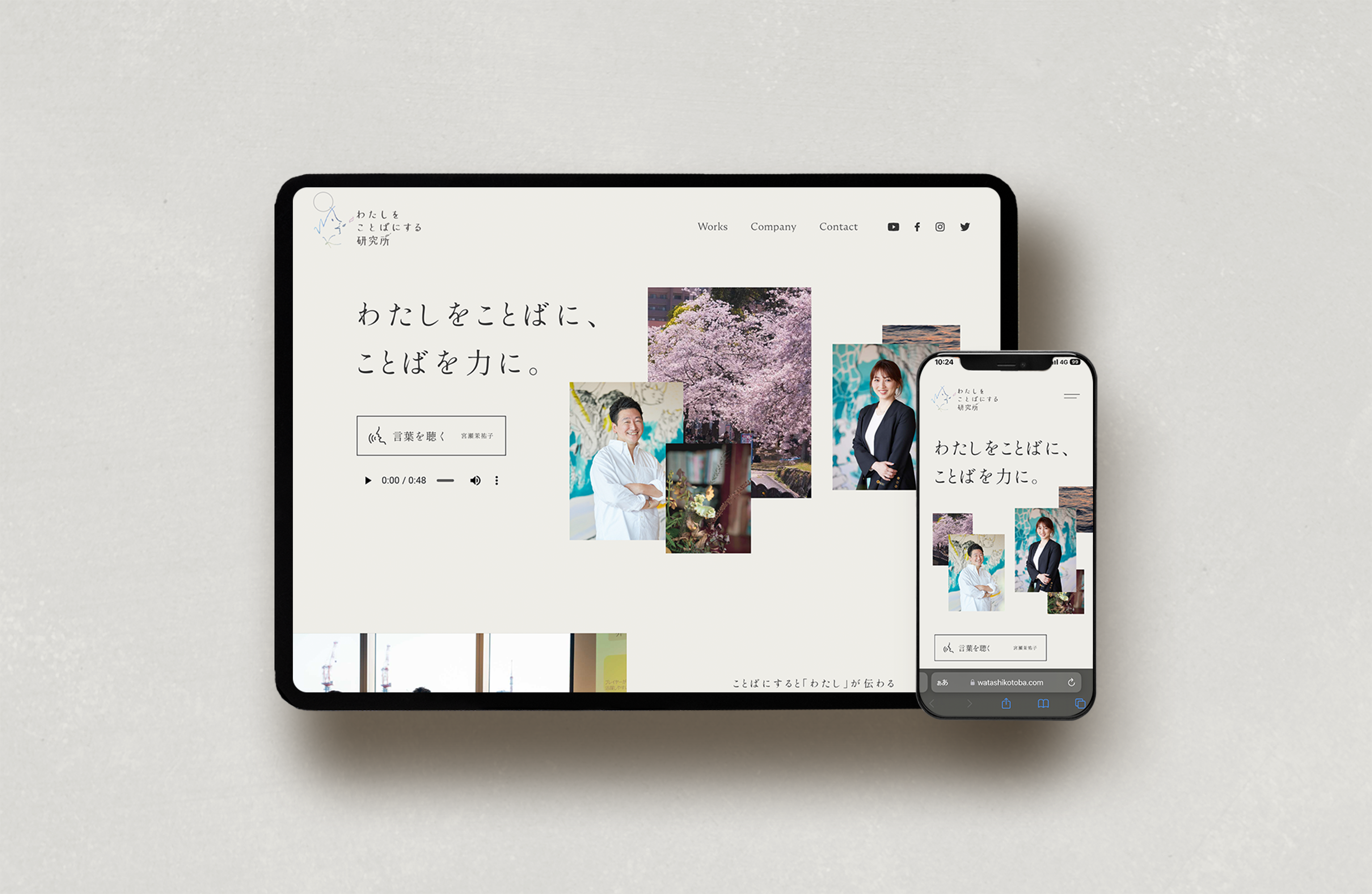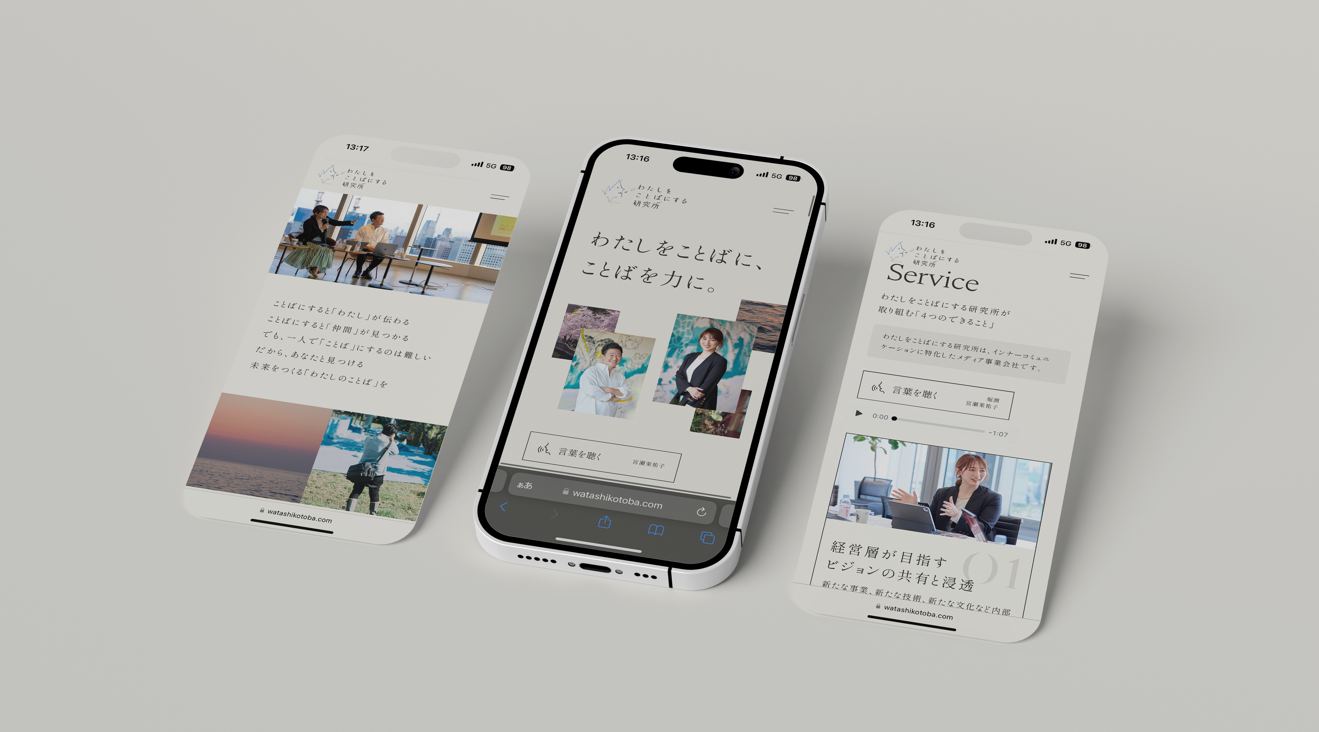 81plusは、堀潤氏・宮瀬茉祐子氏が運営する「わたしをことばにする研究所」のコーポレートブランディングを実施しました。本プロジェクトではコピーライティング・メッセージやビジュアルを作成し、コーポレートサイトとして落とし込みました。サイト内には元アナウンサーである両氏の”ことば”も音声コンテンツとして格納し、表示される画像やメッセージと合わせて理解を深められるインタラクティブなサイトを構築しました。